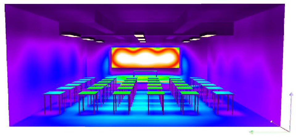 王朗說道,“我們根據(jù)每個學校的勘測數(shù)據(jù)為每個教室建立3D模型,通過燈光模擬測算光環(huán)境數(shù)據(jù),以此為基礎設計燈具的安裝間距、安裝高度、投射角度等參數(shù),解決了投影儀位置影響黑板燈照明效果的問題。在產品選型上,我們選擇了公司自研的SUNFLY護眼教室燈和SUNFLY可調角黑板燈,確保達到最佳照明效果。”